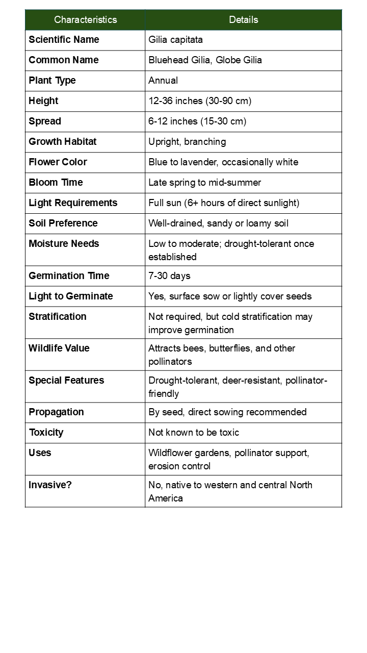 Discover the charming Globe Gilia (Gilia capitata), a delightful native annual that brings soft, powder-blue spherical blooms to your wildflower garden. These enchanting flowers create a dreamy, cottage garden atmosphere while supporting native pollinators.