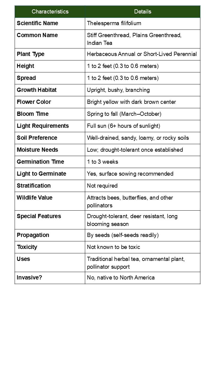 Greenthread (Thelesperma filifolium), also known as Stiff Greenthread or Plains Greenthread, is a resilient native wildflower that brings months of cheerful yellow daisy-like blooms to challenging dry sites. This hardy perennial is perfect for gardeners seeking low-maintenance, drought-tolerant plants that attract pollinators and thrive in poor soils.