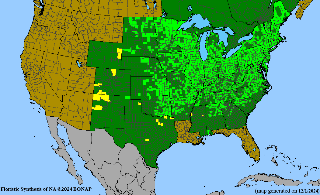 Dark Green indicates the plant is native within the state, yellow rare, the lime green indicates where the plant is native and seen more within a state.
