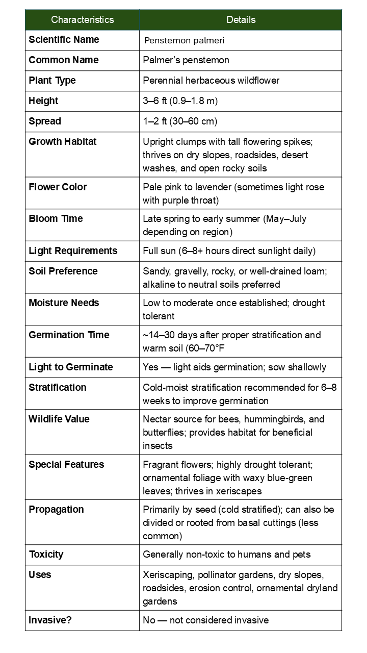 Palmer's penstemon (Penstemon palmeri) is a stunning perennial wildflower native to the arid and semi-arid regions of the western United States, especially common in Utah, Arizona, Nevada, and New Mexico. This remarkable plant brings both beauty and ecological value to your landscape.